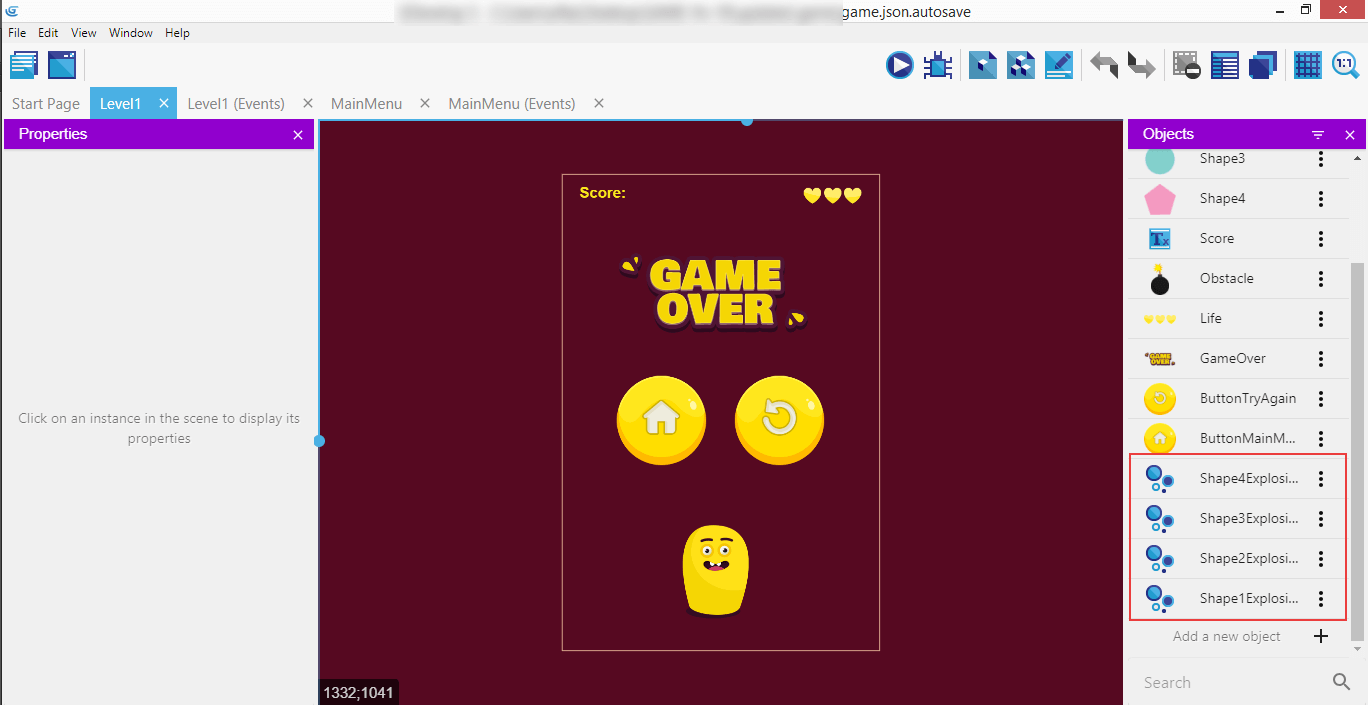 Those emitters will spawn small shapes as particles after the Monster collects it. Object's name will be "Shape1Explosion", kind of particles: "Textured", then select the geometry1.png image, and enter the respective values: start with 20 particles, their height will be 20 pixels, start and end opacity will be 255, so they will be fully visible.