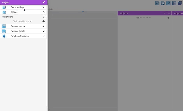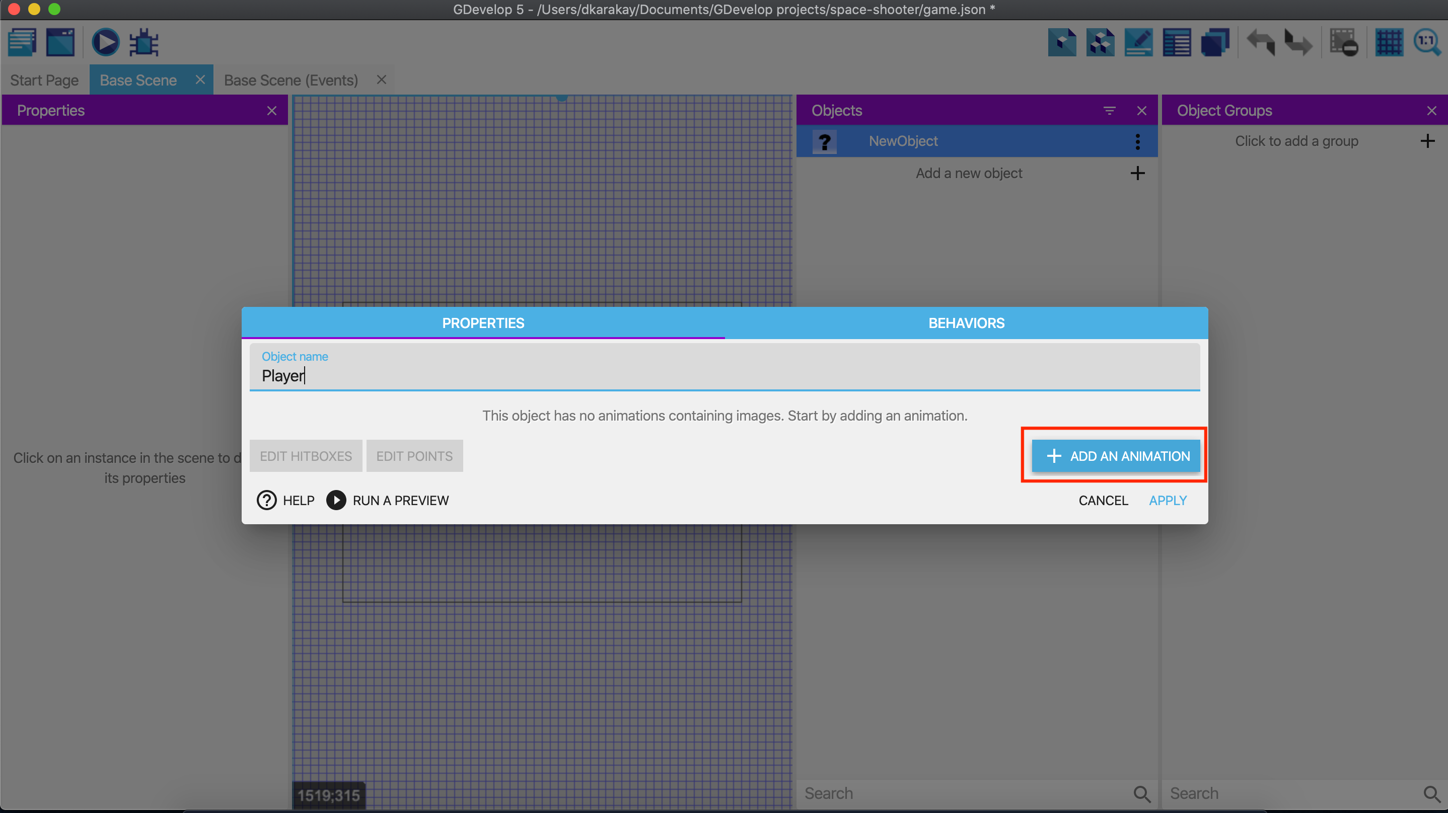 We are ready to add our player (space ship). After downloading the assets from here, we will click the "Add a new object" button.