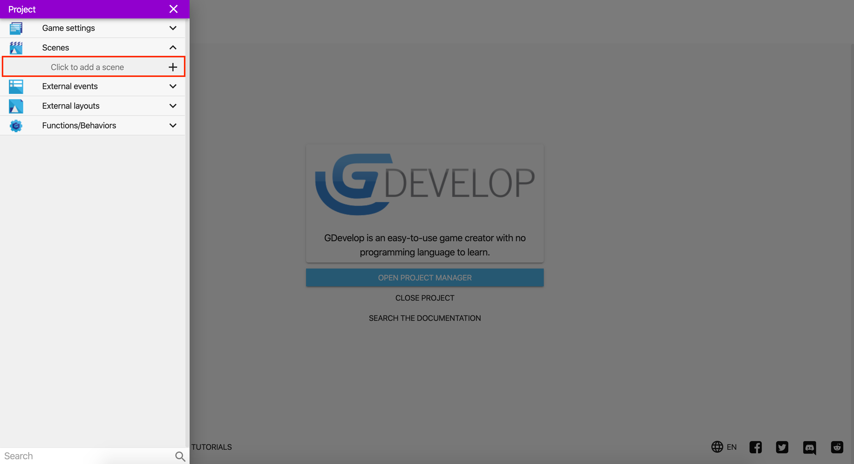 To add a scene, you should select the Scenes section on the left panel and a Click to add a scene button.