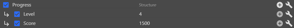 Если у переменной-структуры Progress есть дочерние элементы «Level» со значением 4 и «Score» со значением 1500, результирующий JSON будет выглядеть: {"Level": 4, "Score": 1500}.
